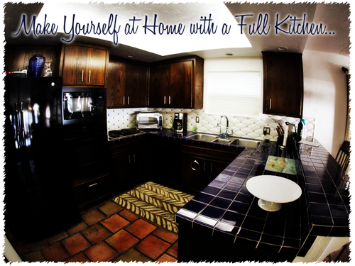 The rental Beach House kitchen is fully equipped and includes a Maytag Stainless Refrigerator, JennAir oven and microwave, filtered water, wood cabinetry, tile countertops, and more.